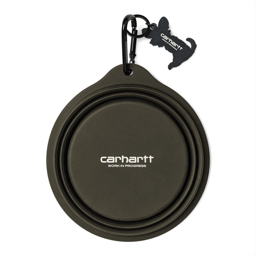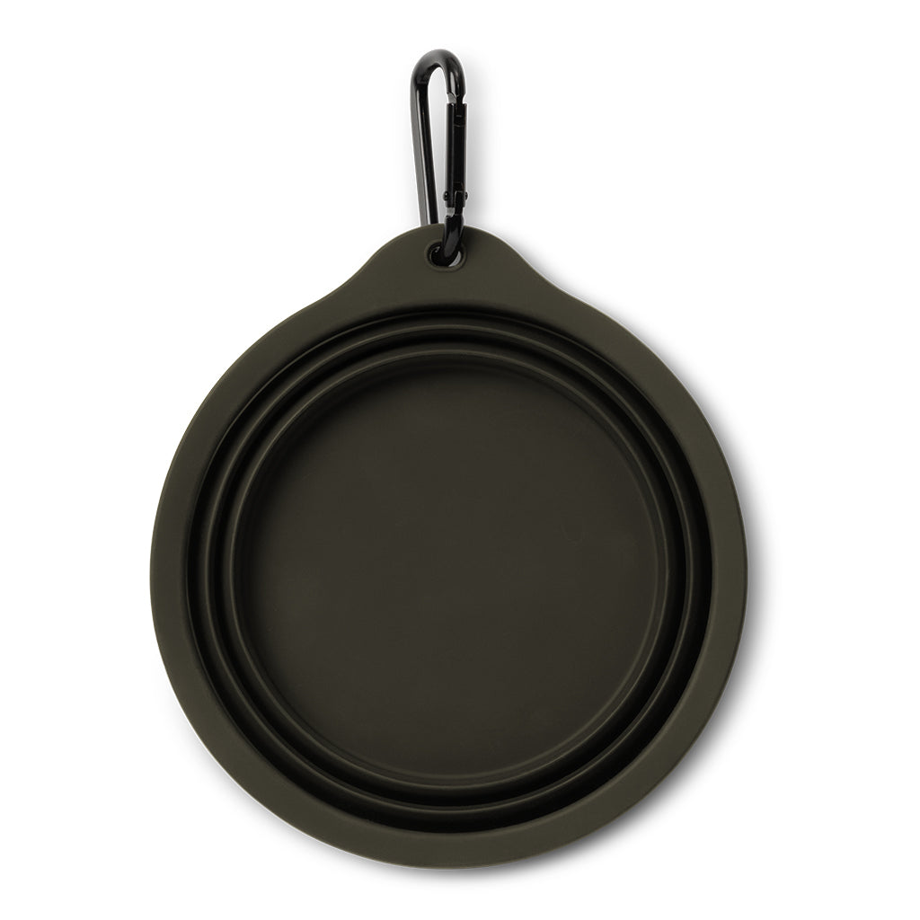 The Wild Dog Foldable Bowl is made from silicone. The design features a graphic rubber pendant with a branded carabiner. A printed Script Logo appears on the bottom of the bowl.