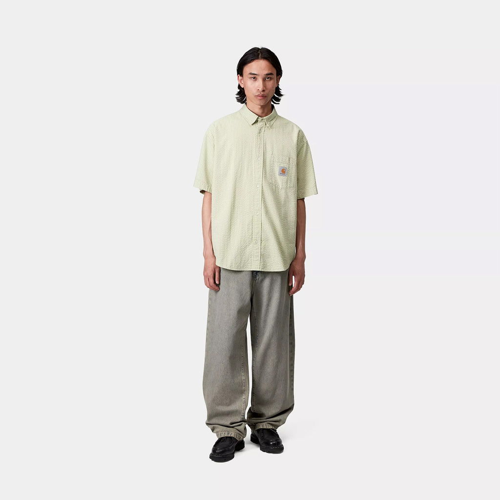 The Landon Pant is a five-pocket style made from heavyweight cotton denim. The item is cut in a loose tapered fit with a regular waist, and features a back yoke, bartack stitching at vital stress points and a zip fly. A woven Square Label appears on the rear pocket.