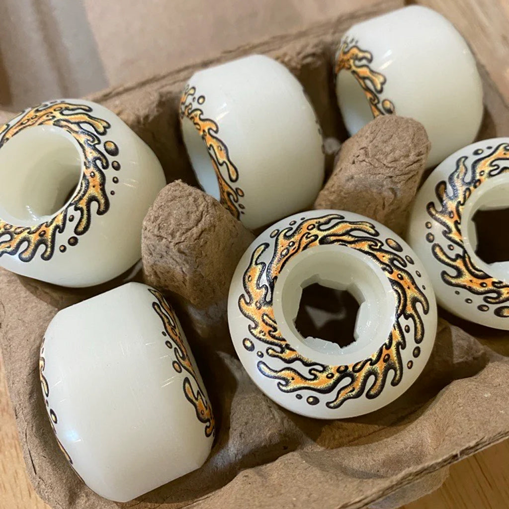 Slime Balls OG Eggs Half Dozen Mini Chubbies Wheels. 6 cage free 45mm white eggs, Grade AAA 99a, small wheels based on Speed Wheels Chubbies of the 90's with 16.5mm riding surface and 30.5mm wide Mini Chubbies design. Custom egg crate packaging. "A Culinary Delite!"