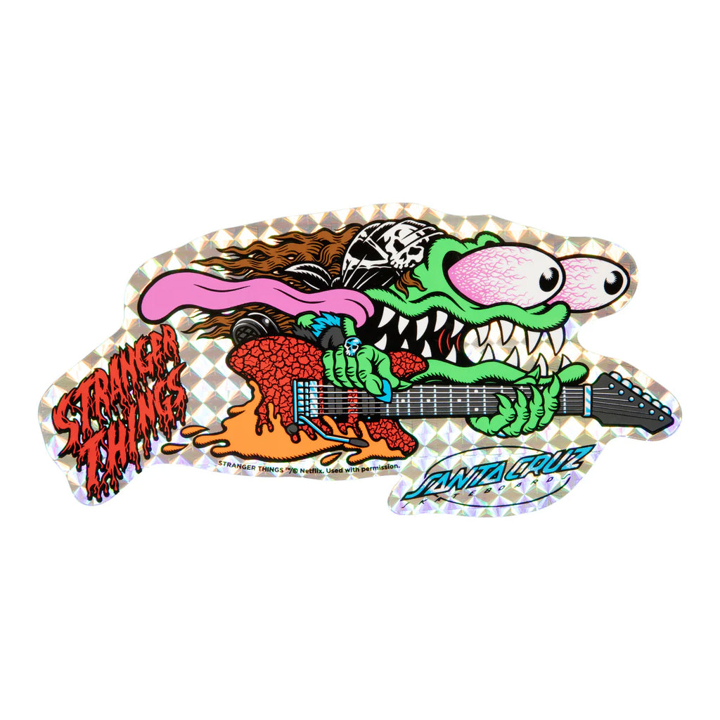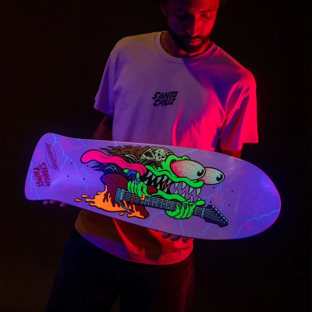 The Santa Cruz Stranger Things Meek Slasher Eddie Reveal 10.1in x 31.13in deck features multicolor glow in the dark graphics that reveal hidden artwork when activated! On Keith Meek's classic Slasher shape.